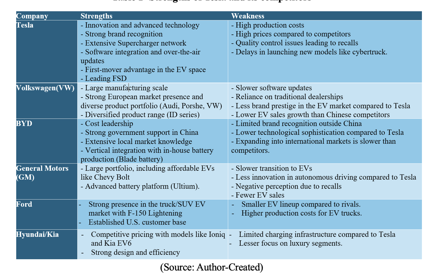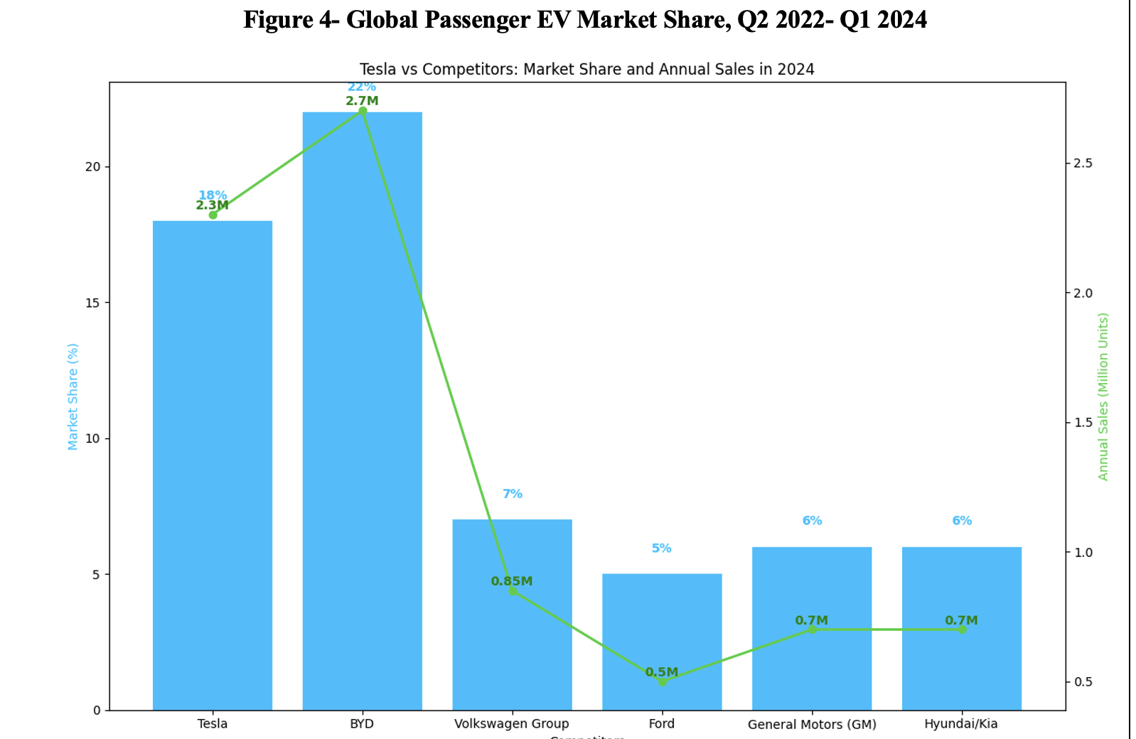 Technological Leadership: Tesla's technological leadership, driven by innovations in battery efficiency, autonomous driving, and over-the-air software updates, gives it a significant competitive edge (Rajsingh, 2024). In contrast, competitors like BYD, VW, GM, and Ford are still catching up in areas such as software integration and autonomous driving capabilities. While these companies are making strides in EV production, they lack the same level of vertical integration and tech-driven agility, limiting their ability to match Tesla’s rapid pace of innovation.