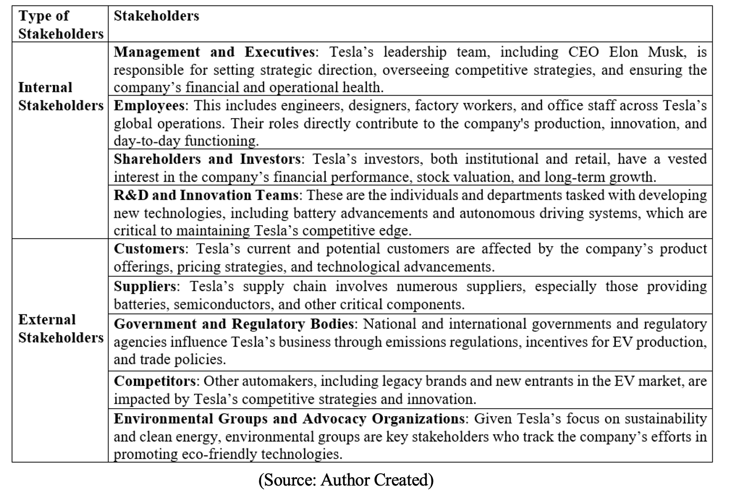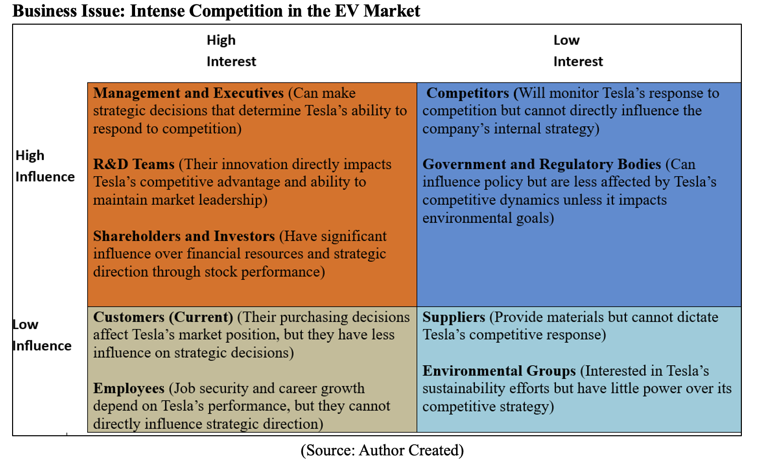 A stakeholder analysis revealed how these challenges impacted diverse groups. Internally, Tesla management, employees, investors, and shareholders were primarily concerned with company’s ability to retain its market dominance and continue delivering innovative products and externally, customers, suppliers, and government agencies were closely monitoring Tesla’s response to growing competition (Hopkins and Lazonick, 2024). Investors sought financial returns and long-term sustainability, while customers were increasingly drawn to more affordable EV options from Tesla’s competitors. Suppliers, particularly those providing raw materials and components, were focused on how Tesla’s production challenges could affect their business relationships. Finally, government agencies were invested in Tesla’s role in advancing clean energy and transportation innovation.
