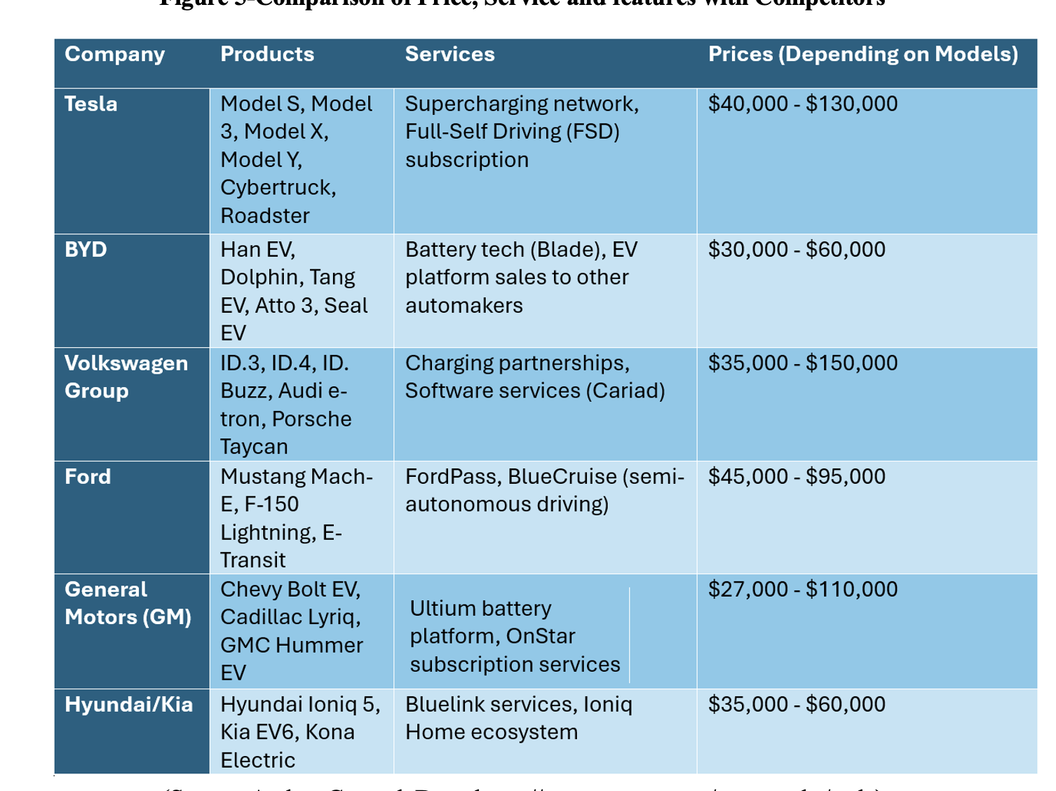 Innovation Competition: Tesla is dependent upon many suppliers for batteries including Panasonic as its long-time partner. Whereas BYD has focused on battery technology, developing its proprietary Blade Battery, which enhances safety and energy density. GM has introduced its Ultium battery system, which allows for flexible battery configurations and faster charging (Hummes et al., 2023), while Ford has been pushing innovation through development of its all-electric Mustang Mach-E and F-150 Lightning, aiming to blend performance with mass-market appeal.